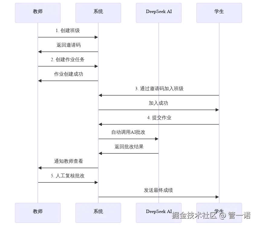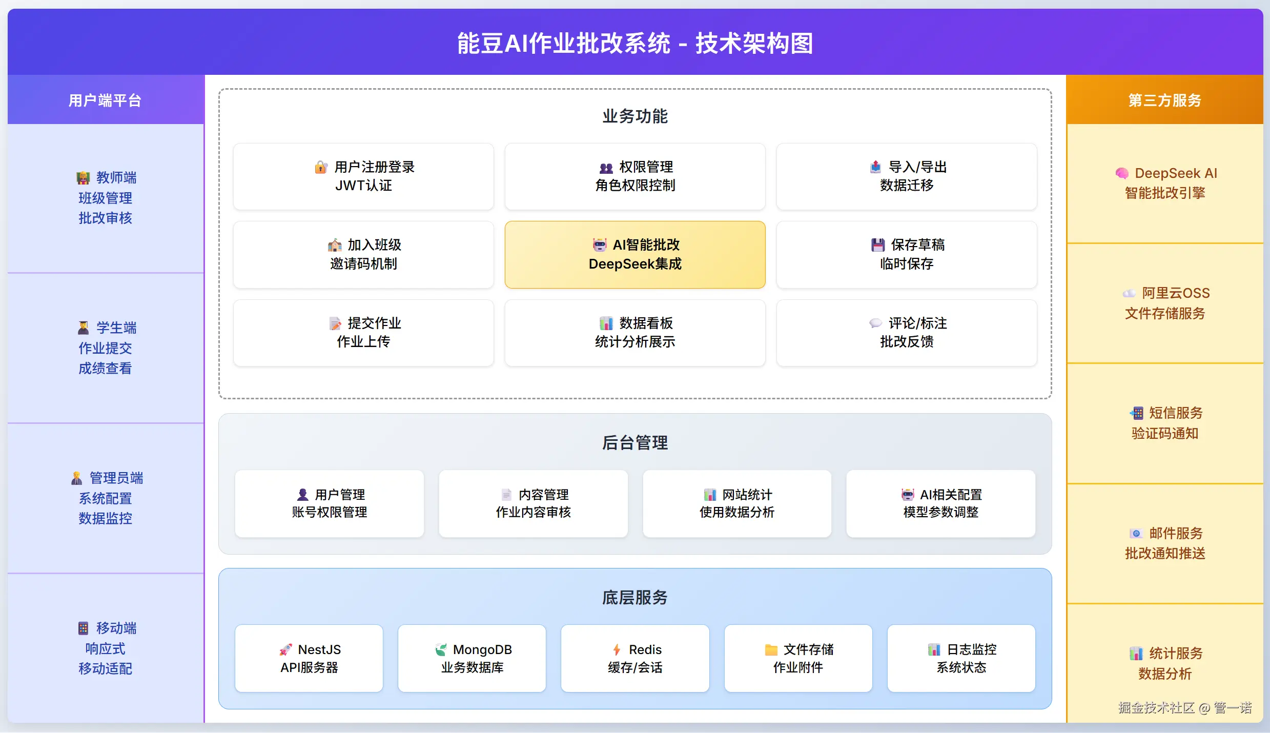 于是就有了"能豆AI"这个产品,集成DeepSeek分析能力,实现了学生在线提交作业 → AI实时批改 → 教师人工核实批改的完整业务闭环。