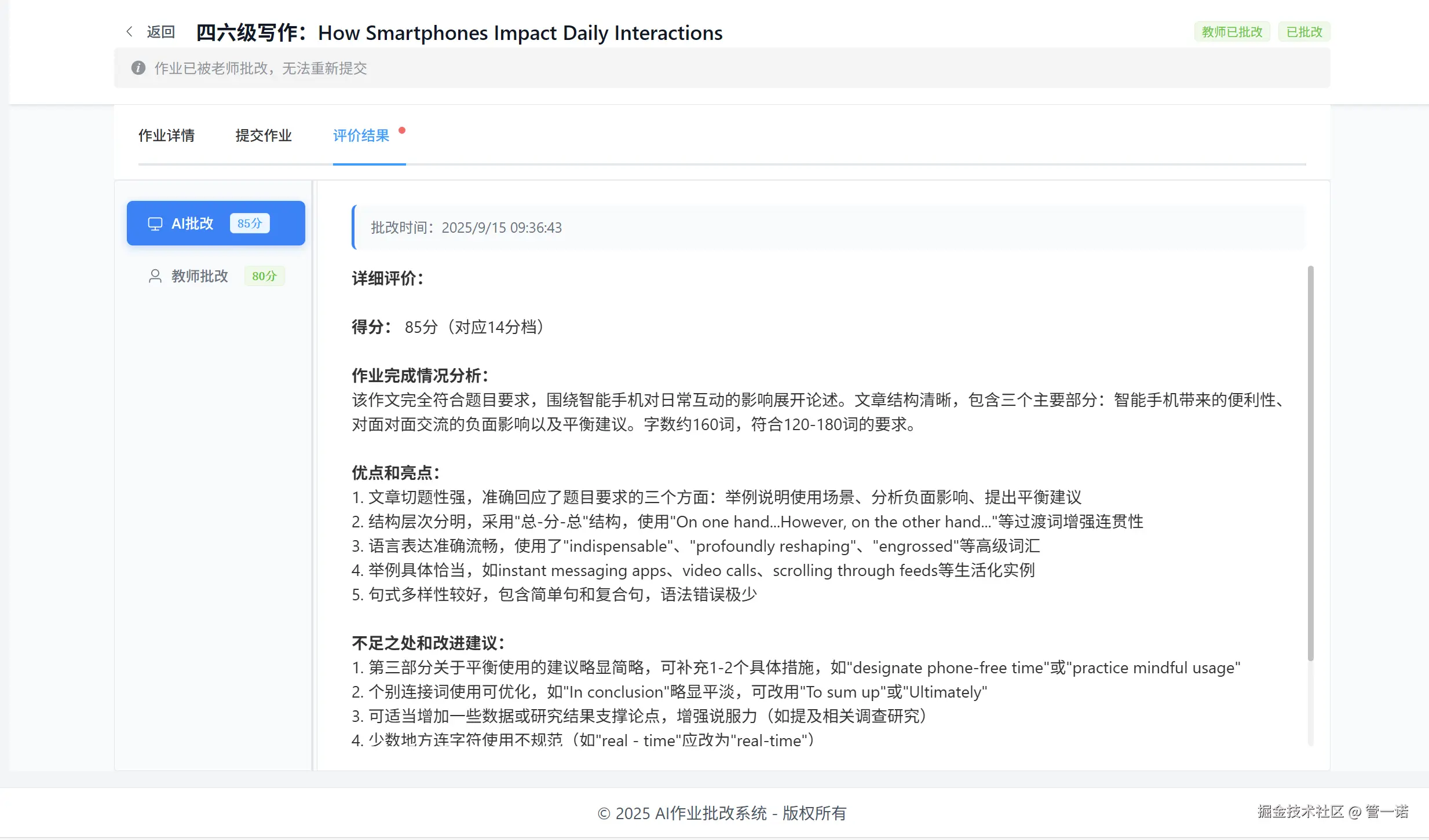 - 批改结果查看:AI初评结果查看,人工复核操作
