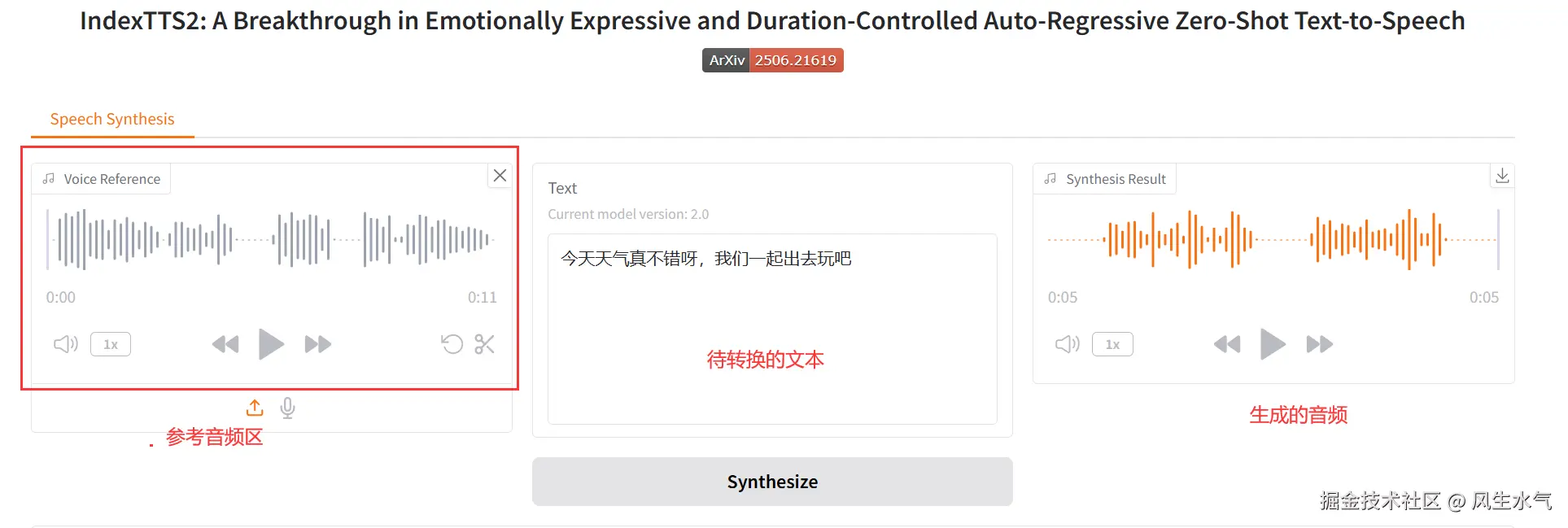 新版本的界面元素和之前的基本保持一致。左侧是参考音频区,供我们上传参考的音频。中间是需要转换的文本,我们可以将我们需要的文本输入进去。 右侧是基于参考音频和文本生成的最终音频效果。当音频生成完成之后,可以点击播放来听生成的结果。同时也可以点击下载这段生成后的音频。