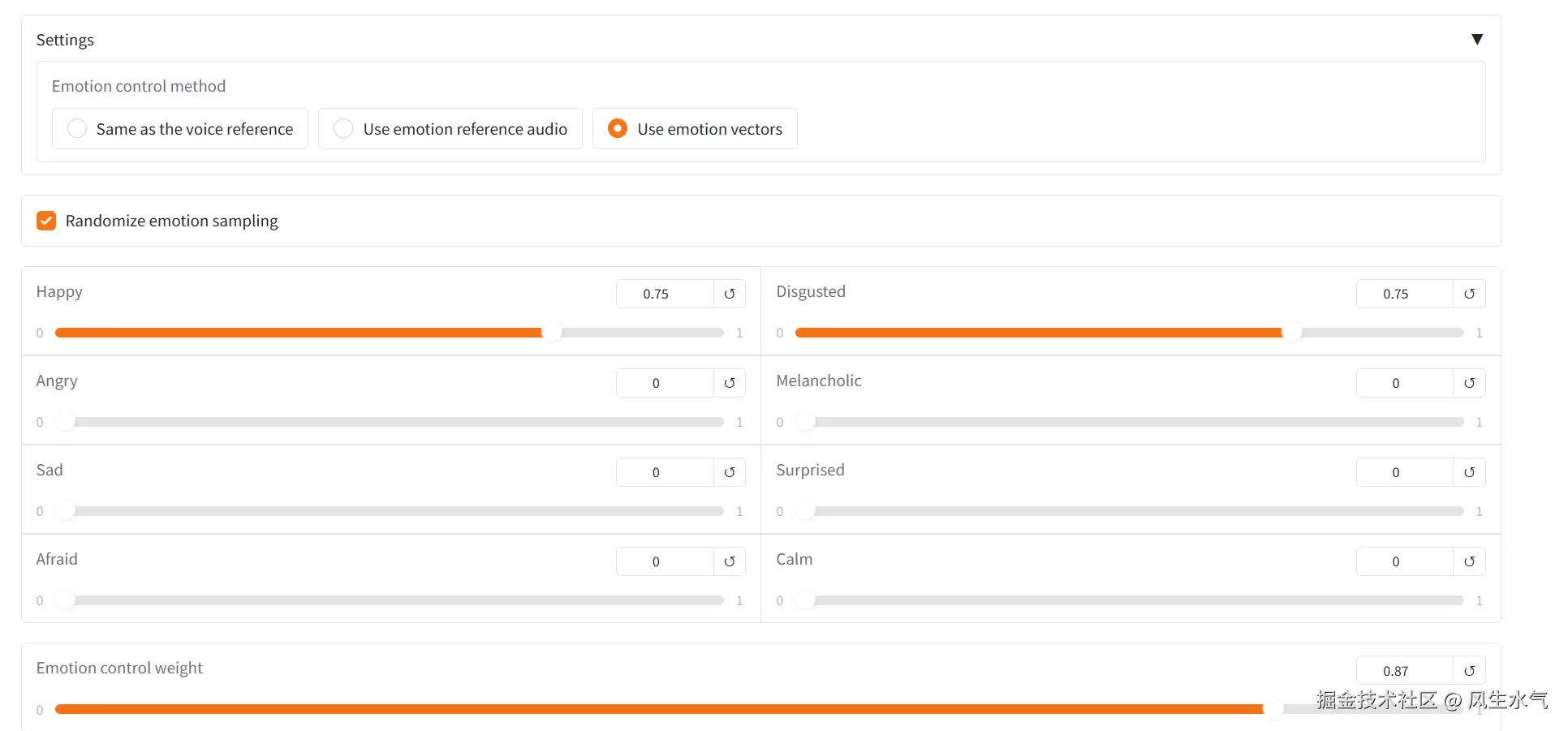 那么,情绪应该如何添加进去呢?这里有三种情绪的添加方式:【Same as the voice reference】是默认选项,这里默认声音的情绪和输入的参考音频的情绪一致。【Use emotion reference audio】则是需要你再上传一段音频作为情绪的参考。【Use emotion vectors】则是使用情绪向量来对情绪进行控制,如下图所示。(这里的情绪向量指的是每一种情绪值对应的程度,是一个0~1之间的值),我们可以通过控制这个值来控制生成的音频中的情绪饱和度