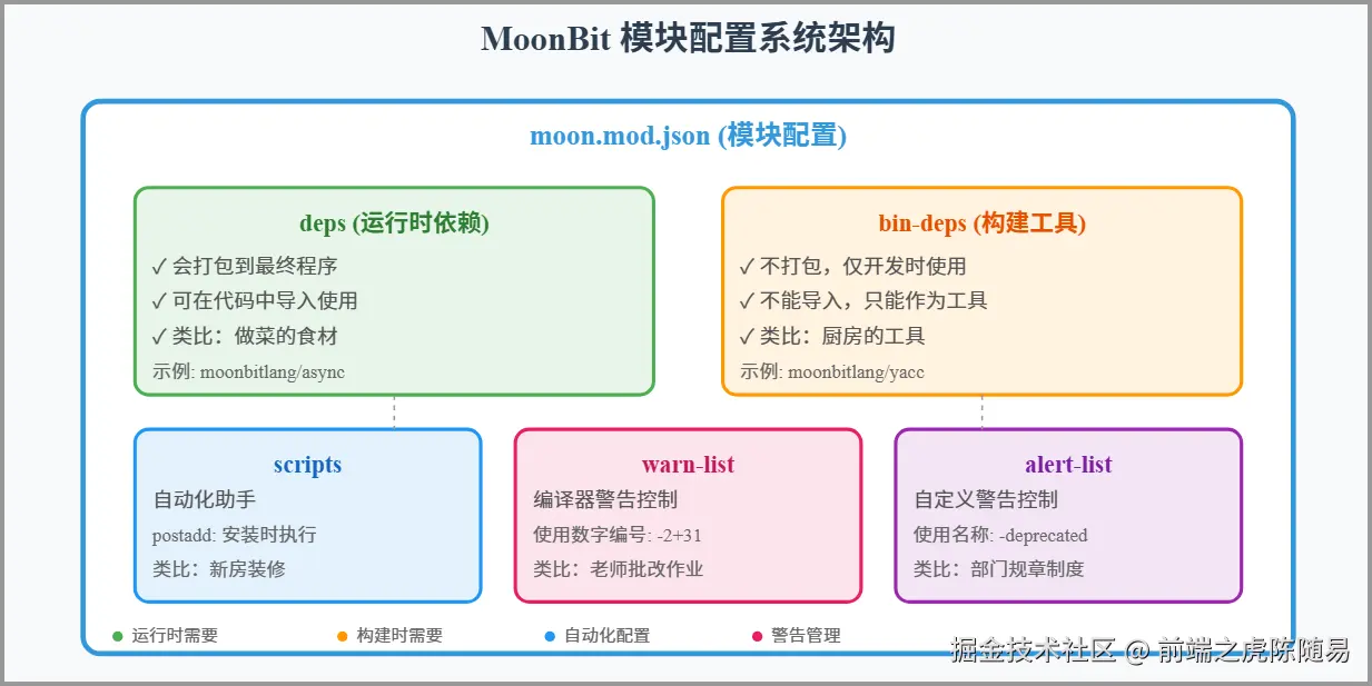 | 配置位置 | moon.mod.json(模块配置) | moon.pkg.json(包配置) |