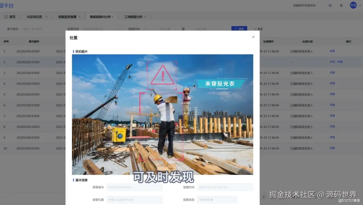 AI智能分析:利用计算机视觉技术,实时分析监控视频中的安全隐患(如未戴安全帽、未穿反光衣、危险区域闯入等)。