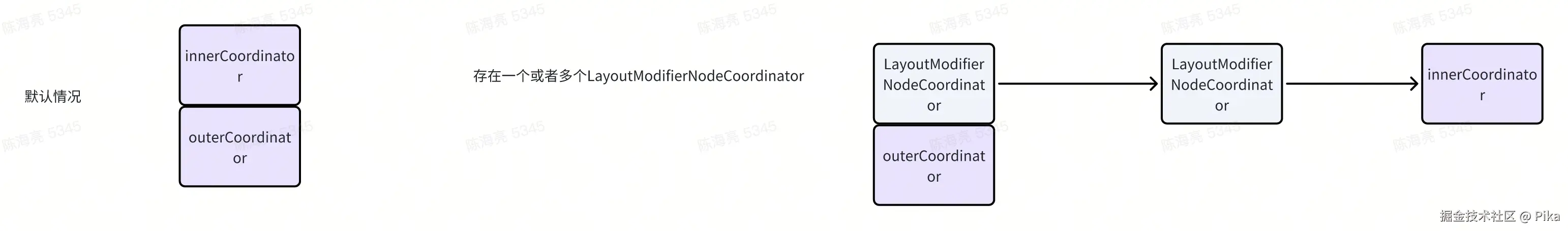 这里我们其实会发现,很多Modifier其实并不会对测量流程产生影响,也不会影响最终的布局展示,如果我们想要对整个树的测量相关的能力进行设计,就会发现很多Modifer.Node的遍历其实是无意义的,因此提出了一个叫NodeCoordinator的概念,它非常抽象,中文来说就是Node协同器,它分为两种InnerNodeCoordinator 与LayoutModifierNodeCoordinator。LayoutModifierNodeCoordinator 是遇到一个LayoutModifierNode就会生成一个,而InnerNodeCoordinator则是每个LayoutNode创建时都会创建一个且仅有一个