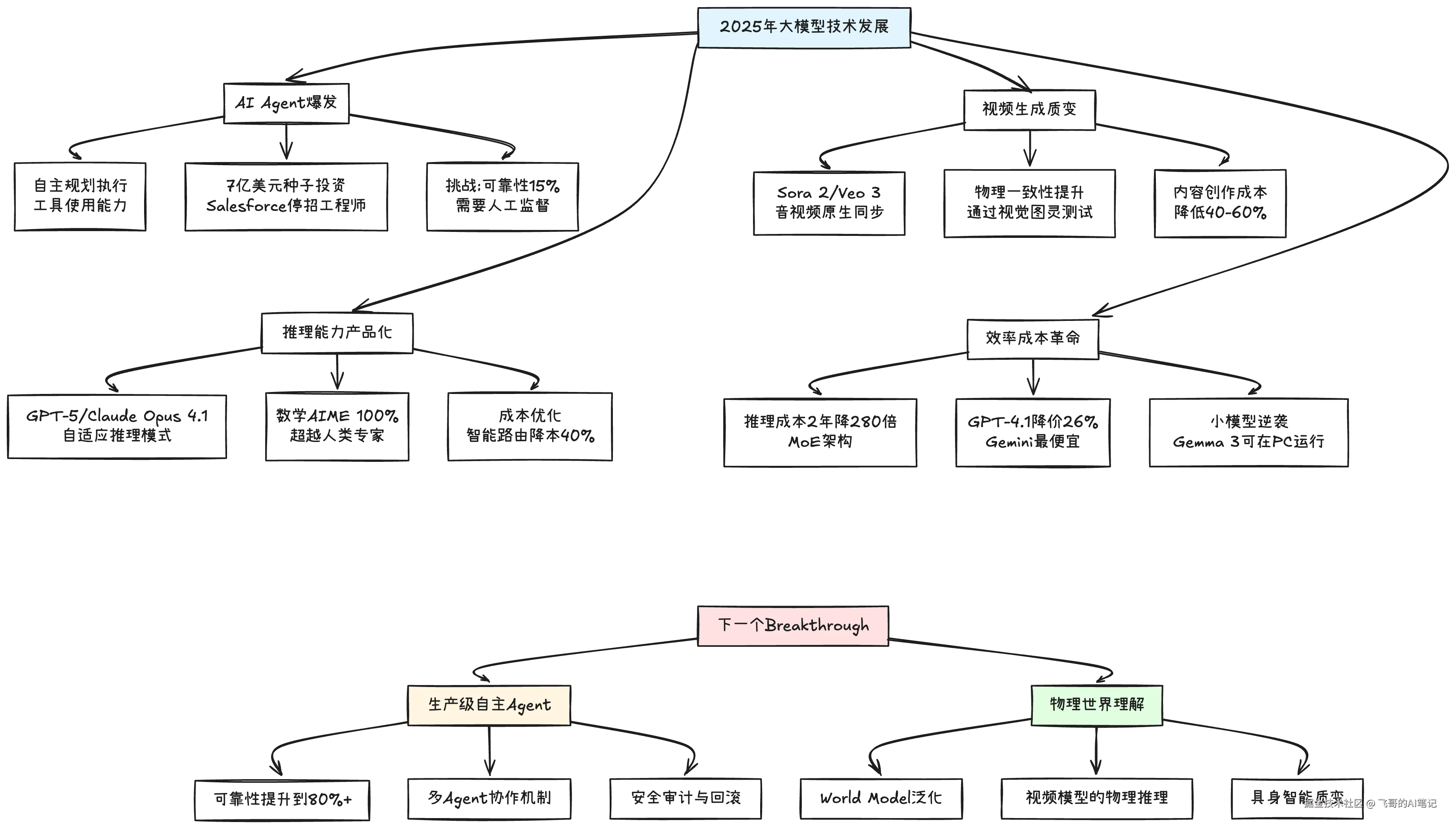 2025年大模型技术发展呈现几个关键趋势。首先是AI Agent的全面爆发,从简单的对话工具演变为能够自主规划、执行复杂任务的智能系统。其次是推理能力的持续深化,GPT-5、Claude Opus 4.1、Gemini 2.5等旗舰模型都配备了"深度思考"模式,能在数学、代码、科学推理等任务上达到人类专家水平。第三是多模态生成的质变,OpenAI的Sora 2和Google的Veo 3实现了视频+音频的原生同步生成,视频质量已经能骗过人眼。第四是效率革命,通过MoE架构、知识蒸馏和量化技术,推理成本在两年内下降了280倍,小模型性能逼近大模型。