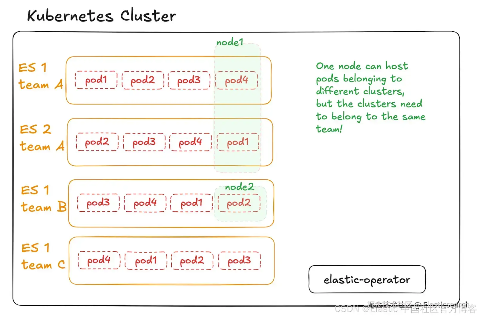 在此架构中,我们使用 Kubernetes 命名空间实现“软”多租户,并结合 Kubernetes 的 taints、tolerations 和 nodeAffinity 实现 “硬” 多租户,从而确保 Kubernetes 集群中的节点只承载属于同一团队的 Elasticsearch 集群的 pods。该场景强制执行更严格的职责分离,但代价是:实际上,这种部署不太可能实现类似的资源和成本效率,因为它可能需要向 Kubernetes 集群添加比严格必要更多的节点,导致部分节点可能被低效利用。