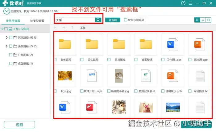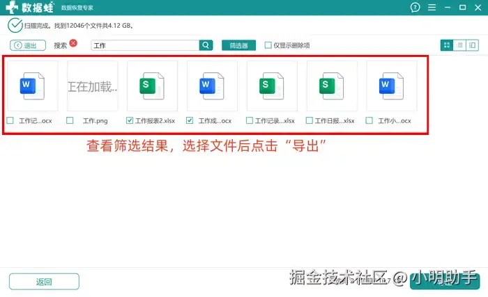 步骤2: 扫描完成后就能选择需要恢复的文件;该软件还配合辅助工具,比如说“搜索框”,我们可以直接通过文件名定位目标文件,选择后点击“导出”;