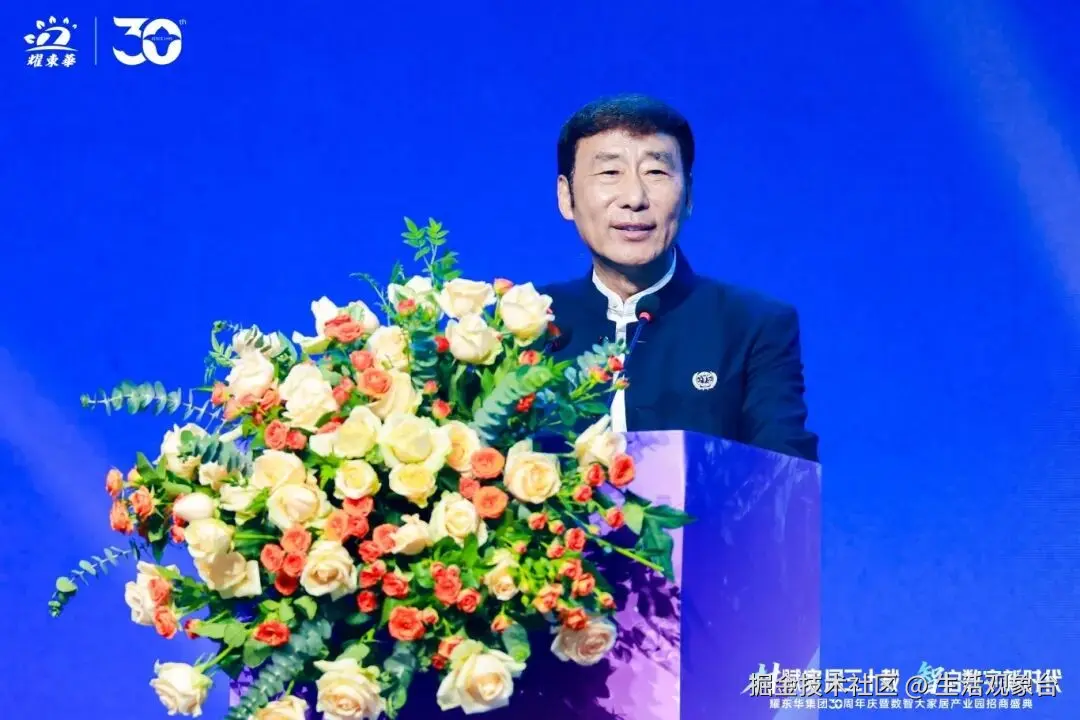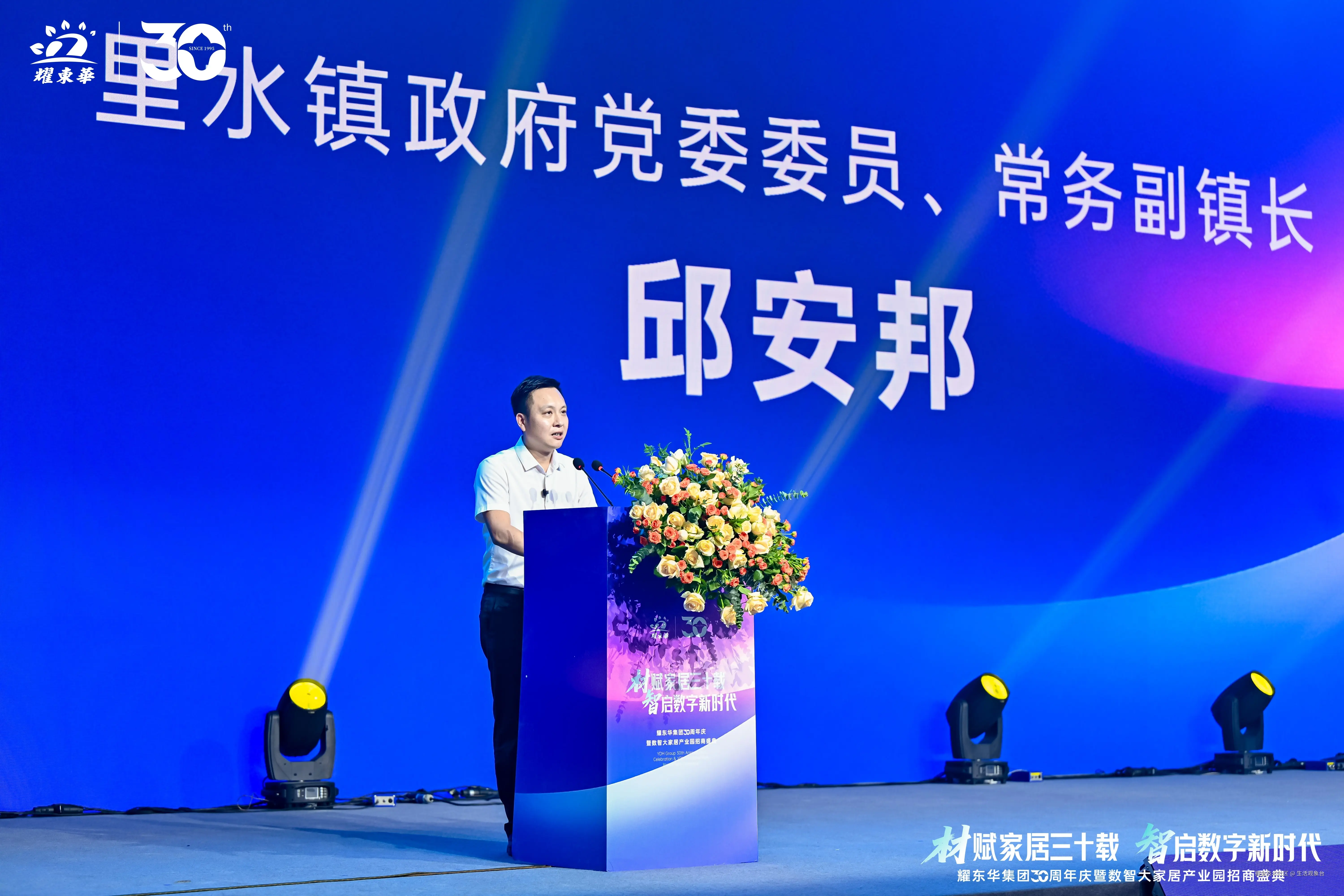 里水镇政府党委委员、常务副镇长邱安邦先生讲话,他表示表示耀东华集团三十年来扎根里水、专注主业,已成为里水泛家居产业生态中的关键力量。从总部大楼封顶到数智产业园招商启动,两大活动紧密衔接,不仅是企业实力的体现,更是里水持续优化营商环境、政企同心推动高质量发展的生动实践。