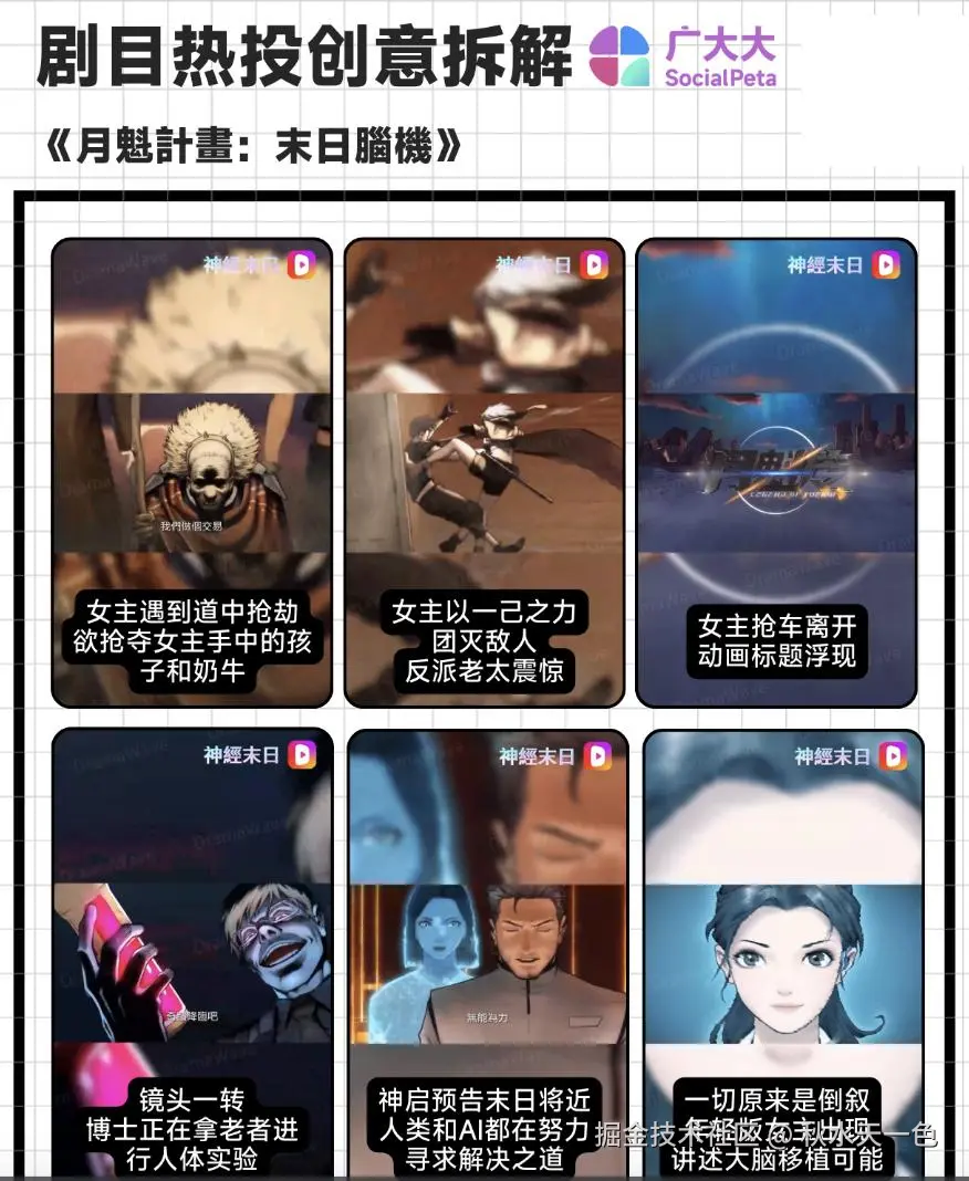 《月魁計畫:末日腦機》目前的去重创意投放数量较低,暂时没有过千,但素材种类偏多元,既有近半小时的超长剧情,也有不到1分钟的精彩剧情快剪。热投素材的剧情和普通短剧形成较大区别,剧情的转折和逻辑描述都非常详细,且主要也是横屏视频嵌套在竖屏模板里,所以观看起来并没有竖屏短剧那么适配。