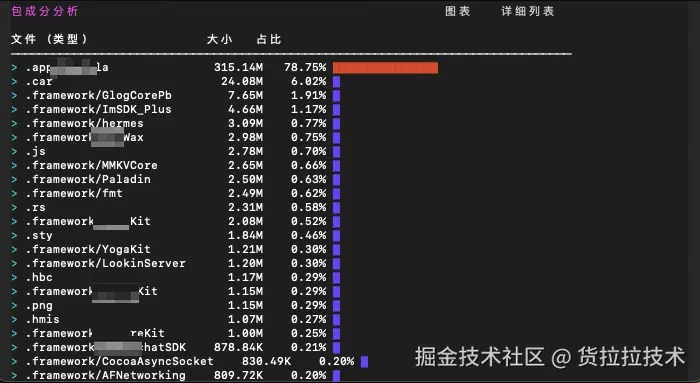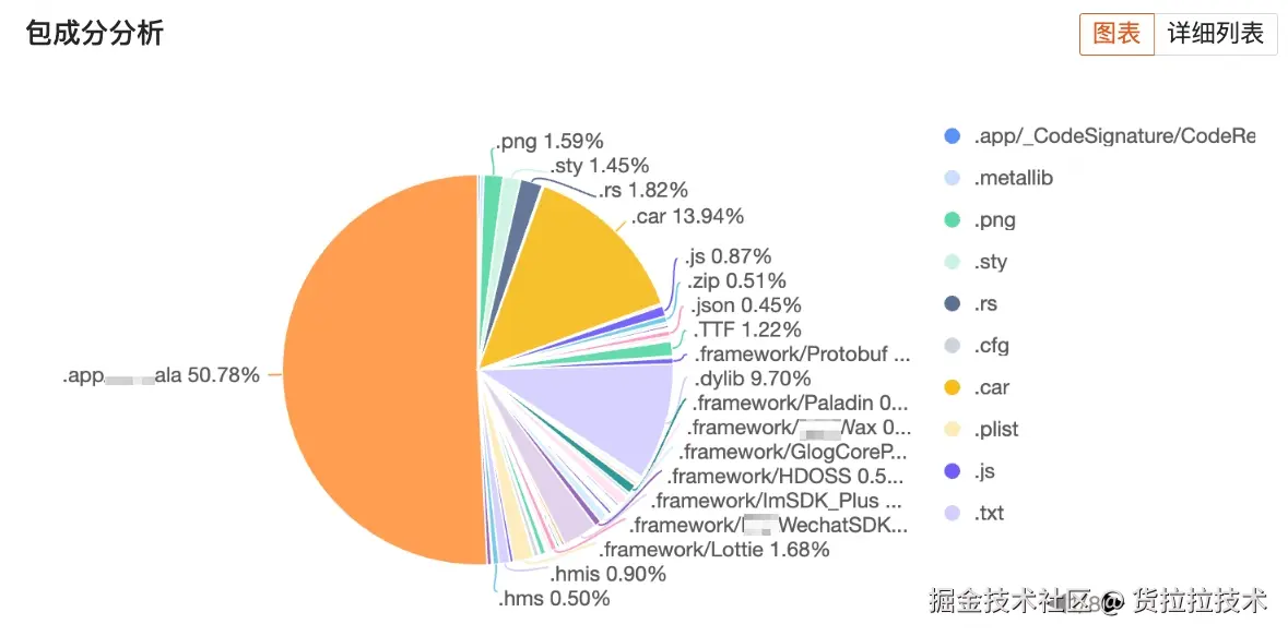 对App包的资源进行优化之前,首先需要对包成分有一个整体的了解,从而做到有的放矢,优化处理占比较大的资源能起到事半功倍的效果,这里我们编写了IPA成分分析的脚本,将成分占比输出到我们的MDAP平台,效果如下: