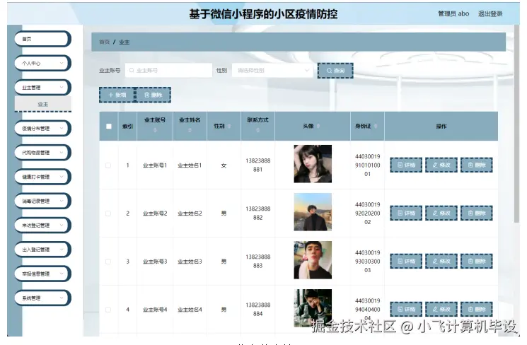 - 业主管理:新增 / 删除 / 修改业主信息(账号、身份证、联系方式);