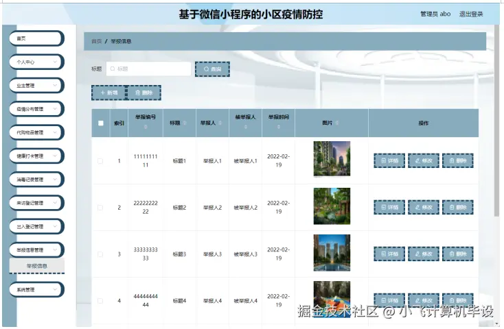 - 举报管理:处理业主举报的 “未戴口罩”“聚集” 等信息,反馈处理结果。