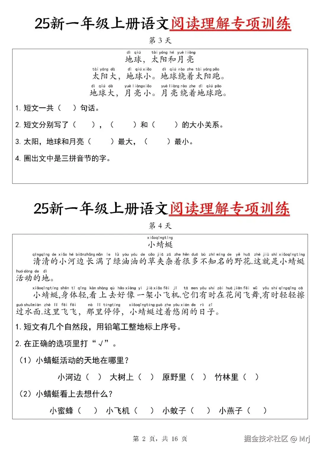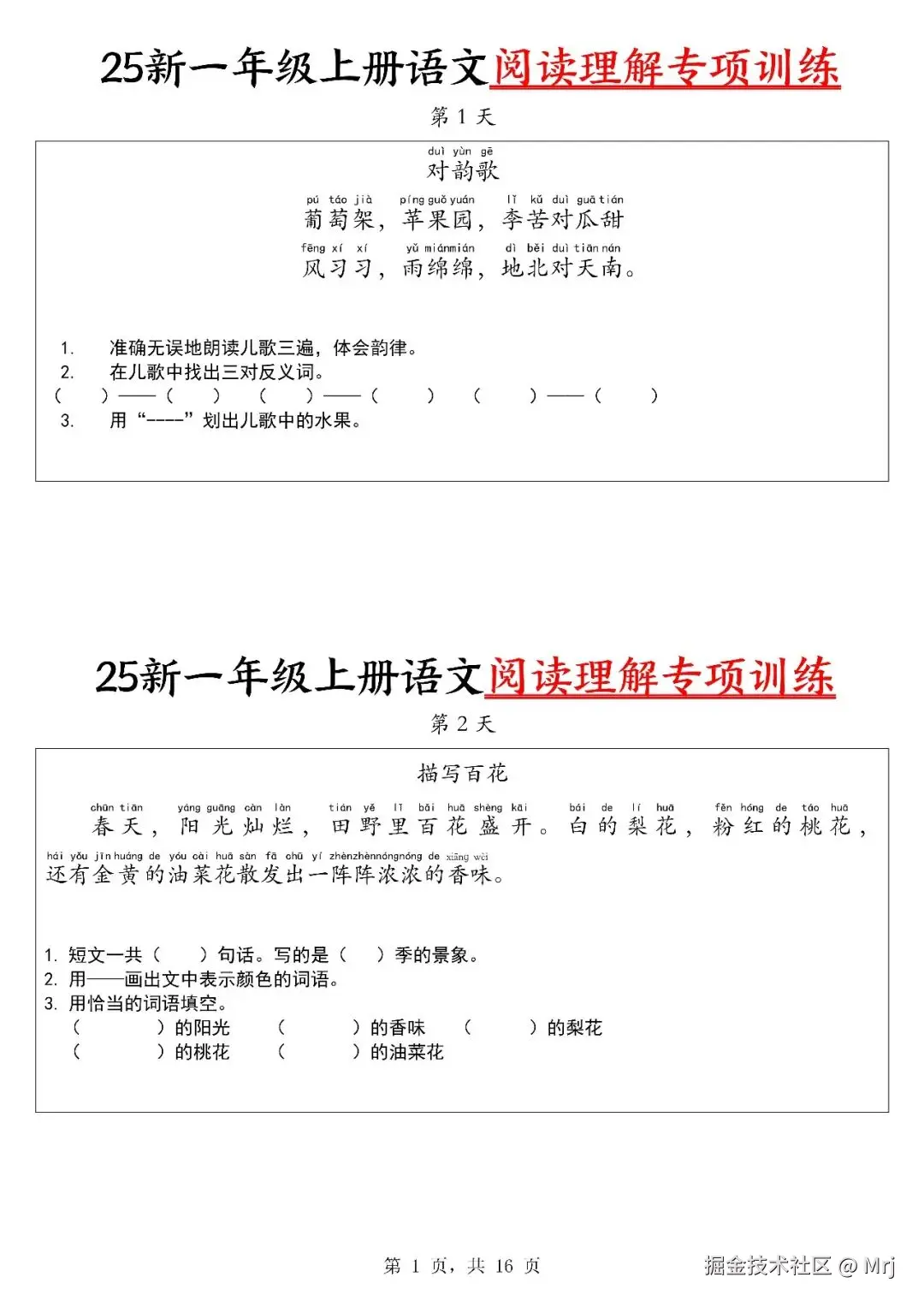【25新一上语文阅读理解专项训练30天(16页)