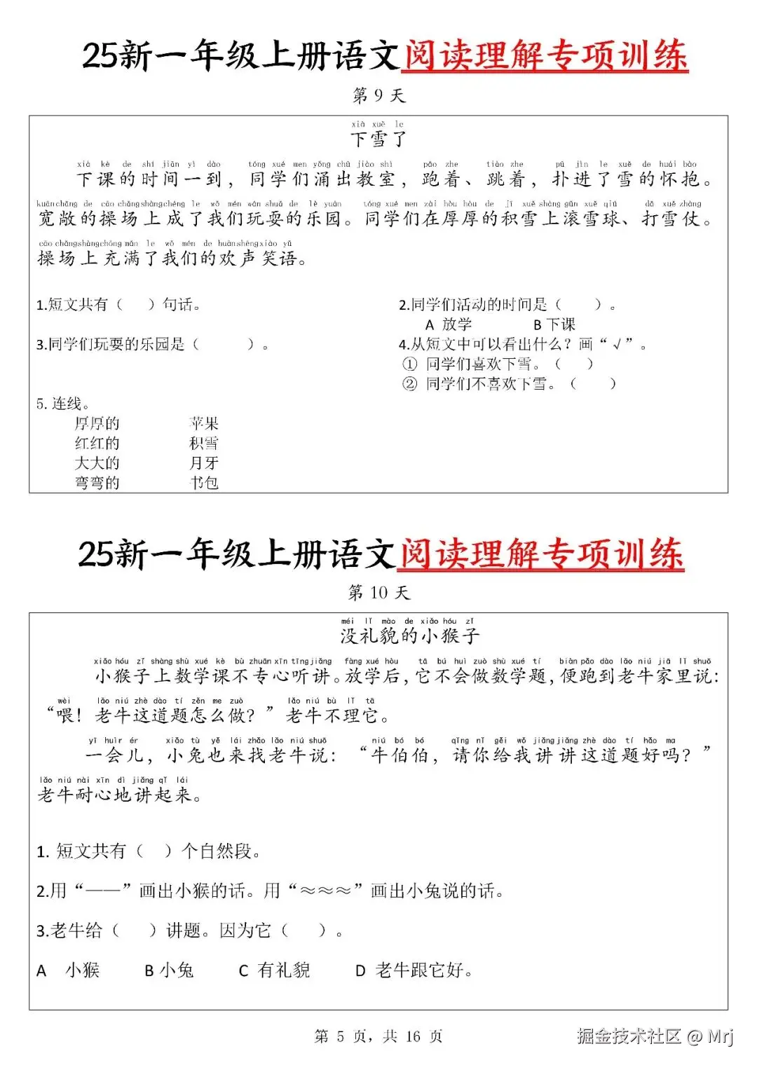 25年一年级上册语文《阅读理解》专项练习每日一练,共30天,电子版可打印可下载,这份一上阅读理解每日一练,帮助孩子学会如何从文中提取关键信息,回答各种问题,提升孩子的文章理解能力。需要的家长抓紧打印出来,让孩子练一练吧。