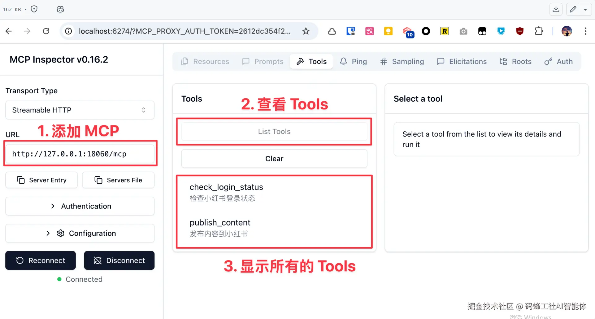 运行后,打开红色标记的链接,配置 MCP inspector,输入 http://localhost:18060/mcp ,点击 Connect 按钮。