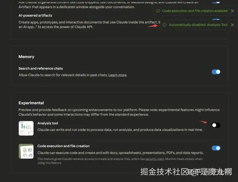 Claude新出了Code execution and file creation这个experimental feature,不过和原来的Anylysis tool是互斥的,开启“文件创作模式”时,系统会自动关闭“Analysis tool”。因为这是两个并行的的沙箱环境。
