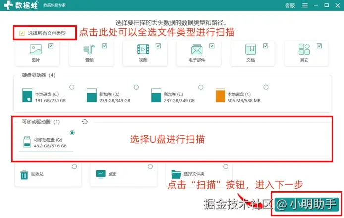 第1步: 通过下载合适的版本(Windows和Mac有各自适配的版本)后打开软件,进入软件的扫描设置界面,选择目标文件的类型和扫描U盘,点击“扫描”;