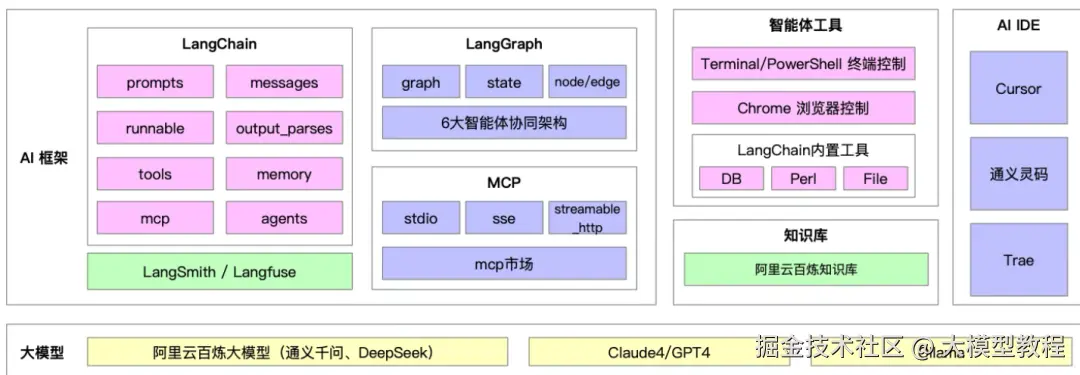 这一层包括三个核心框架:LangChain、LangGraph 和 MCP。