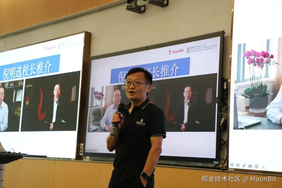 现场师生观看完港科广创校校长倪明选院士对MoonBit和MGPIC的致辞后,信息枢纽 陈雷 院长致辞,表达了对MoonBit的认可,鼓励港科广学子学习使用MoonBit,积极参与MGPIC大赛。