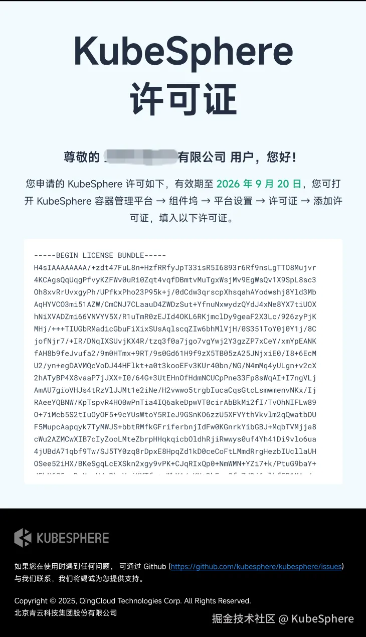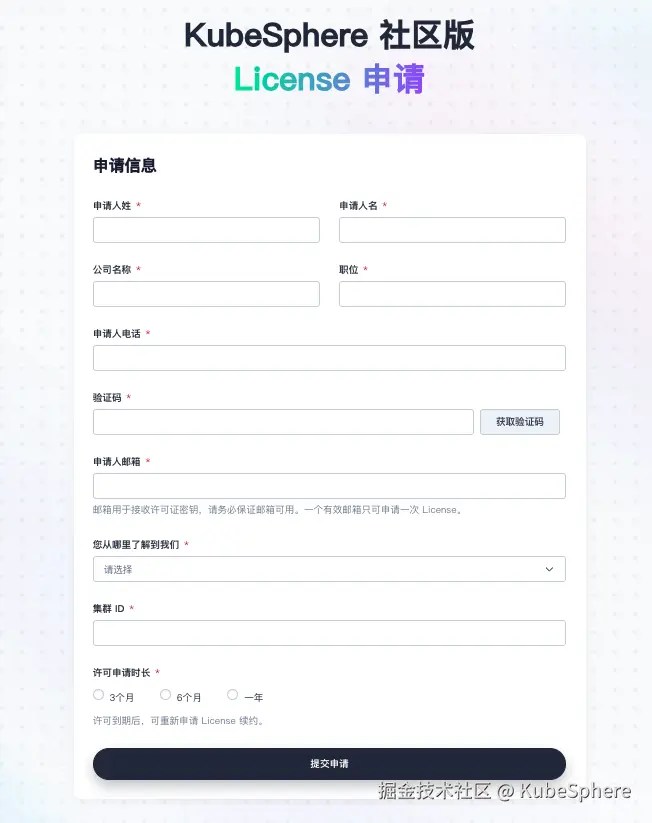 通过官方链接申请 KubeSphere 社区版的免费许可证,填入个人信息和集群 ID,提交申请。随后许可证将发送至您的邮箱(邮件可能会被拦截,如长时间未收到,请尝试在垃圾箱中查找)。