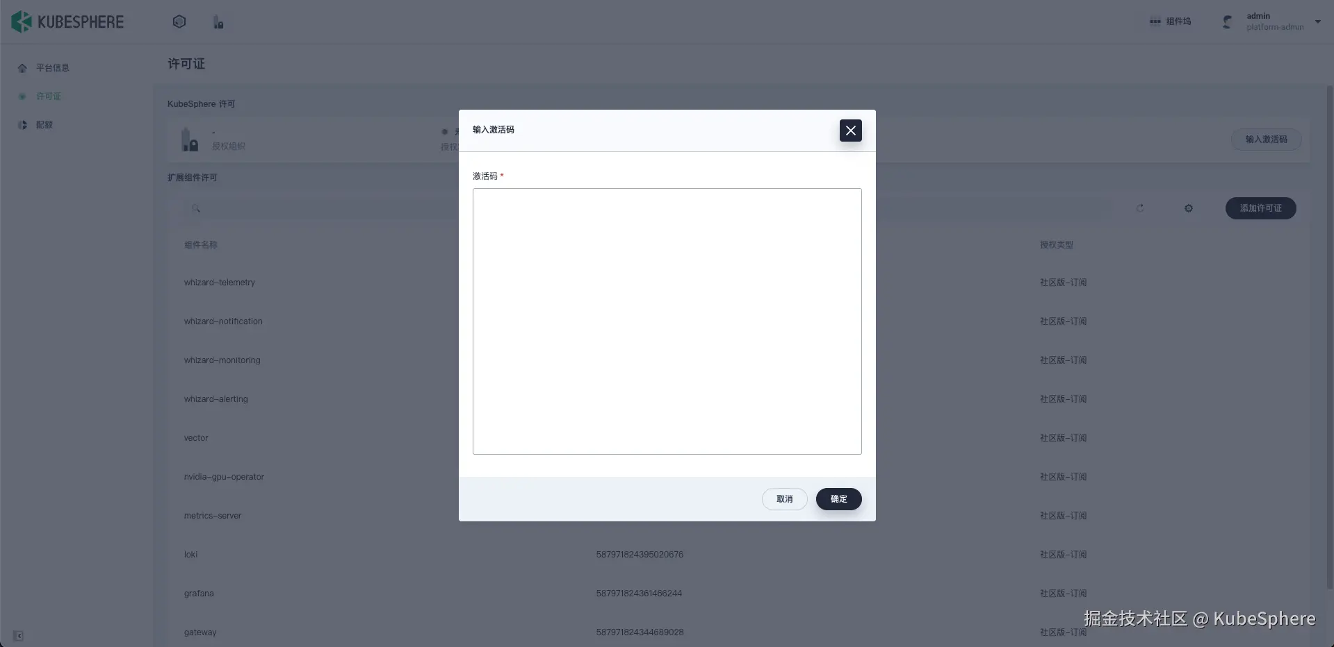收到邮件后,复制邮件中的授权码,打开 KubeSphere 容器管理平台,进入组件坞 → 平台管理 → 许可证页面,点击添加许可证,将授权码填入即可完成激活。
