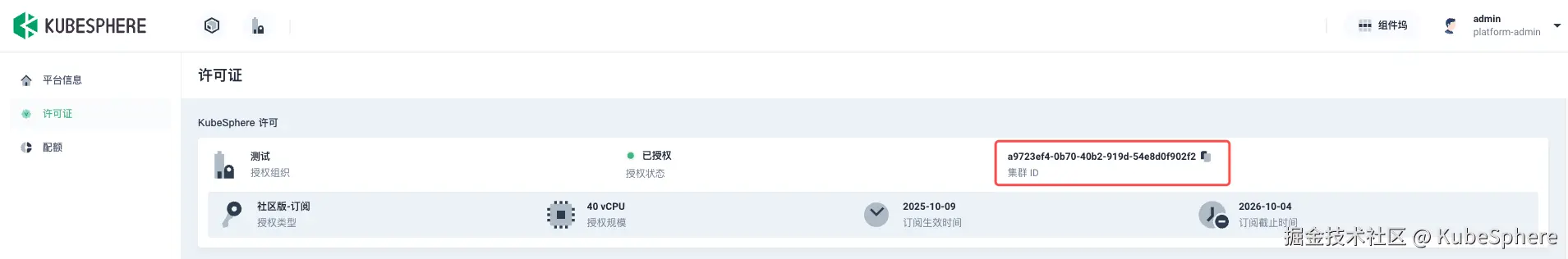 完成 KubeSphere 安装后,打开 KubeSphere 容器管理平台,进入组件坞 → 平台管理 → 许可证页面,获取当前集群的集群 ID。