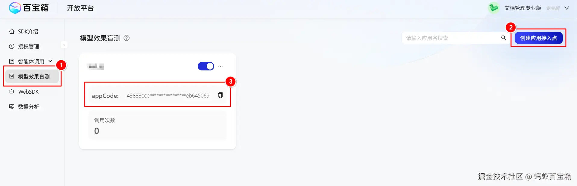 | AppCode | 是 | String | 应用接入点 code。获取路径:访问模型效果盲测 > 新建应用接入点 > appCode。 | 202506e******00450562 |