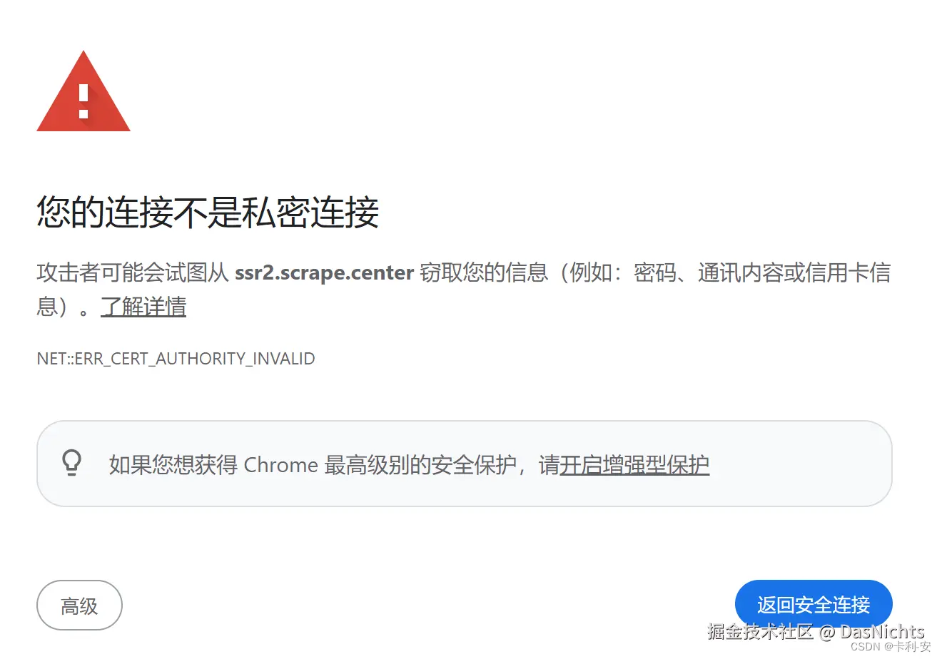 例如这个实例网站:https:/ssr2.scrape.center/,如果用Chrome浏览器打开它,则会提示“您的连接不是私密连接”这样的错误