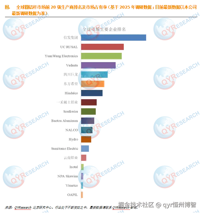 全球范围内,圆铝杆主要生产商包括信发集团、UC RUSAL、YuanWang Electronics、Vedanta、四川巨龙、东方希望等,其中前五大厂商占有大约45.37%的市场份额。