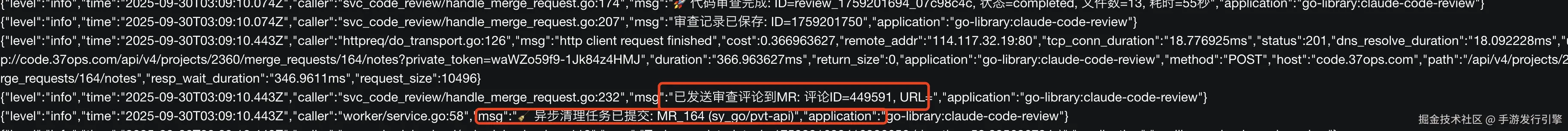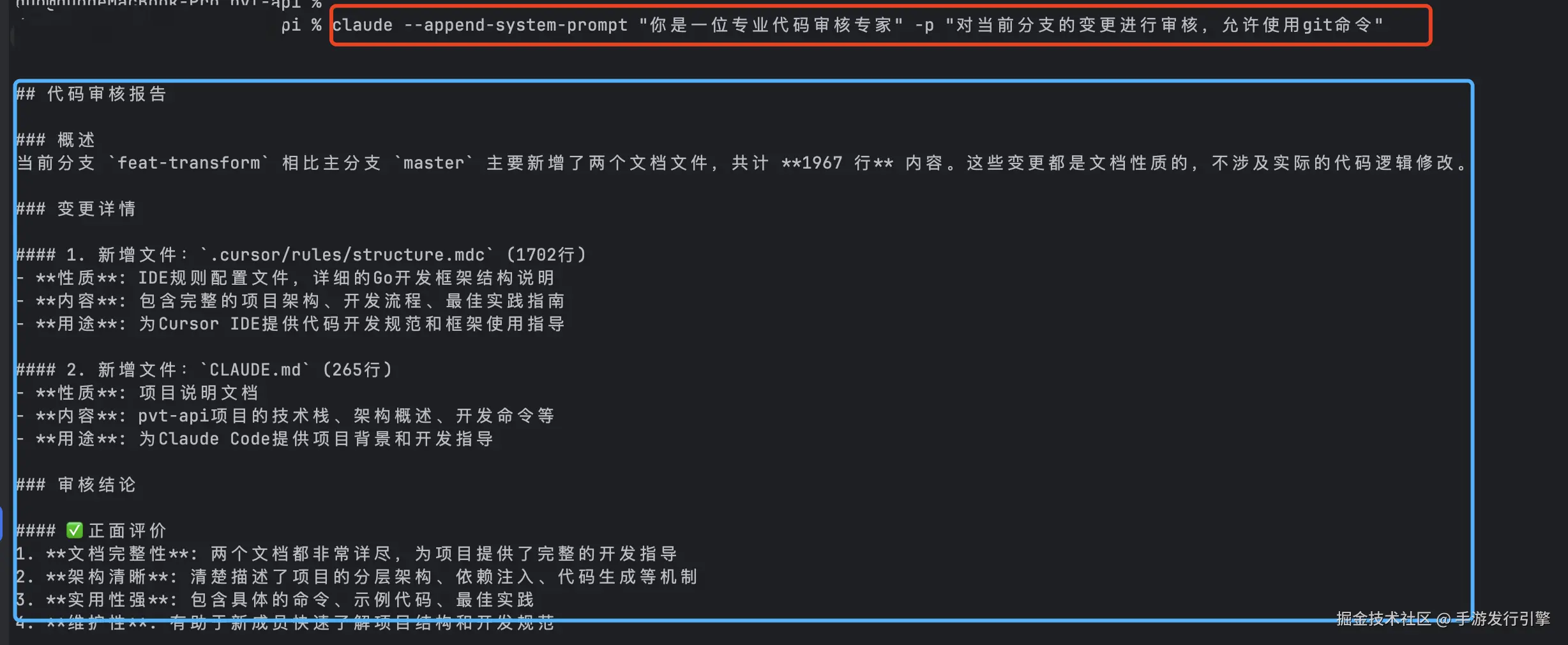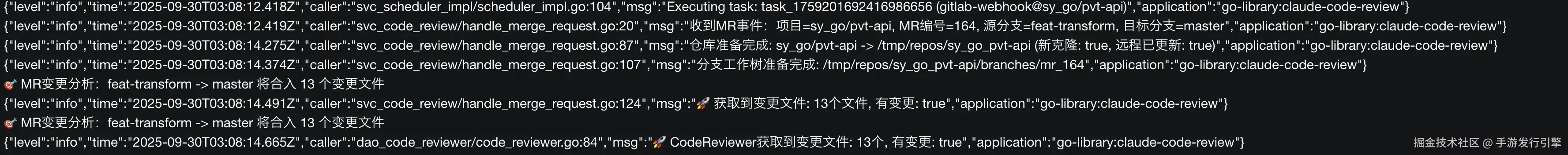 准备好代码后,系统会调用 Claude CLI 执行实际的审查工作。Claude 在安全的 Git 环境中分析代码,利用完整的项目上下文生成详细的审查建议。