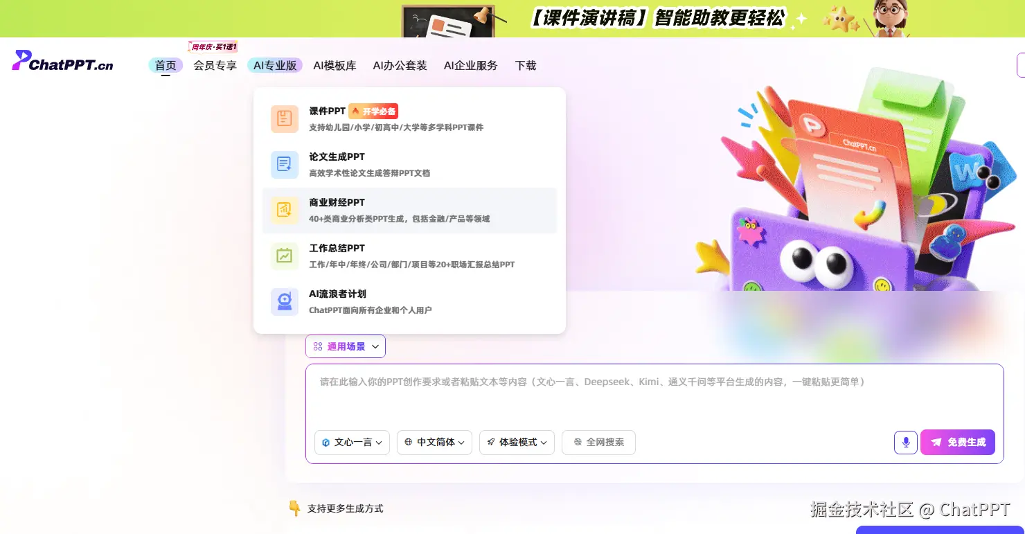 最近AI PPT工具火得不行,我也跟风试了好几款。说实话,大部分用下来有点失望:有的“一键生成”点进去步骤比我自己做还复杂;有的“智能美化”完,内容直接“面目全非”,还得花大量时间改回去……直到遇到ChatPPT,才算找到一个愿意继续用下去的。