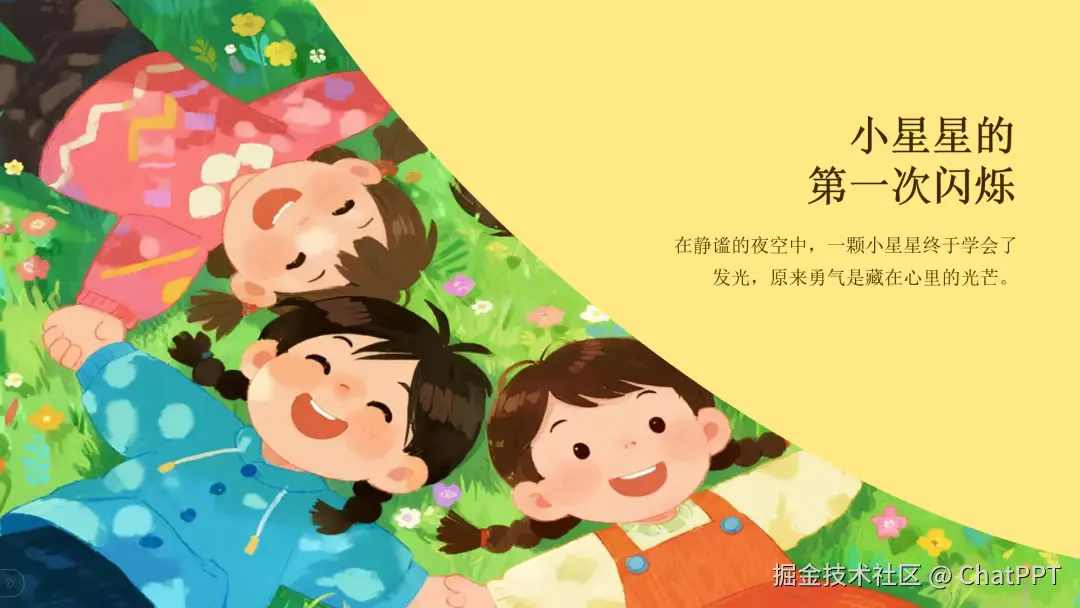 除了美化现有内容,ChatPPT还提供根据场景生成完整PPT的“专业版”功能,覆盖课件、商业财经、论文答辩、工作总结等多种类型。不同专业版所生成的PPT均具备良好的内容适配性与视觉完成度,降低了从零开始的制作门槛。我就拿它最近更新的幼儿园课件PPT来说一说吧!