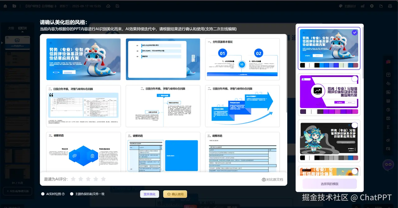 - 能用自己公司的模板! :对我们这些有严格VI规范的公司来说,这简直是福音。我把公司的标准模板上传给ChatPPT学习,之后它生成的所有页面,都自动沿用了我们公司的色系和版式,我再也不用一个个手动调整了,效率提升肉眼可见。