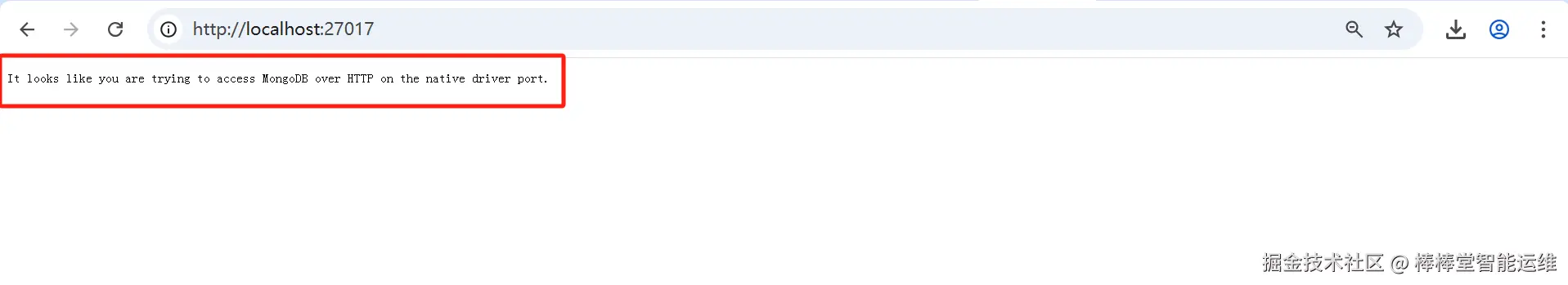 在浏览器地址栏输入http://localhost:27017/回车显示"It looks like you are trying to access MongoDB over HTTP on the native driver port."
