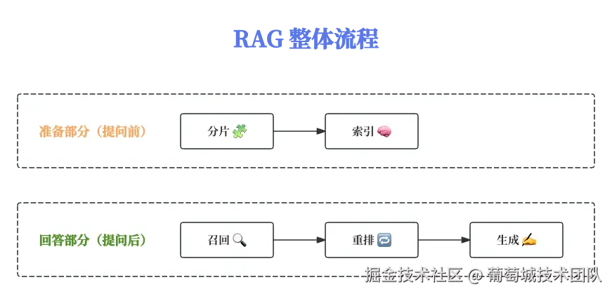 - 回答阶段(⽤户提问后):需要根据⽤户的问题,依次触发回答问题的各个环节,包括召回 、重拍 与⽣成。