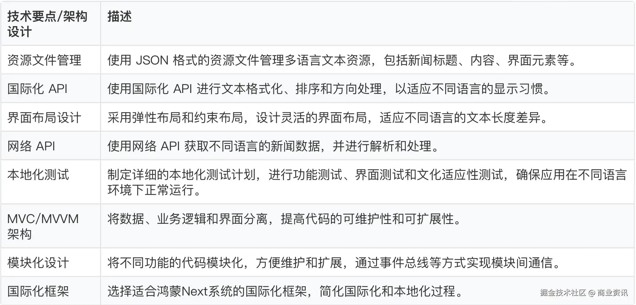 以下是一个总结表格,展示多语言新闻阅读应用的关键技术和架构设计: