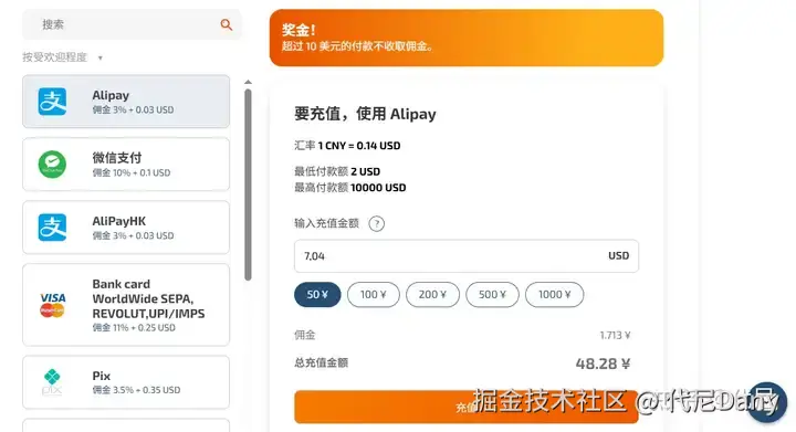 最低可充值 2美元。输入你需要的金额(比如,50元)。你可以看见金额自动兑换成 USD,因为这是平台的主要货币。点击充值
