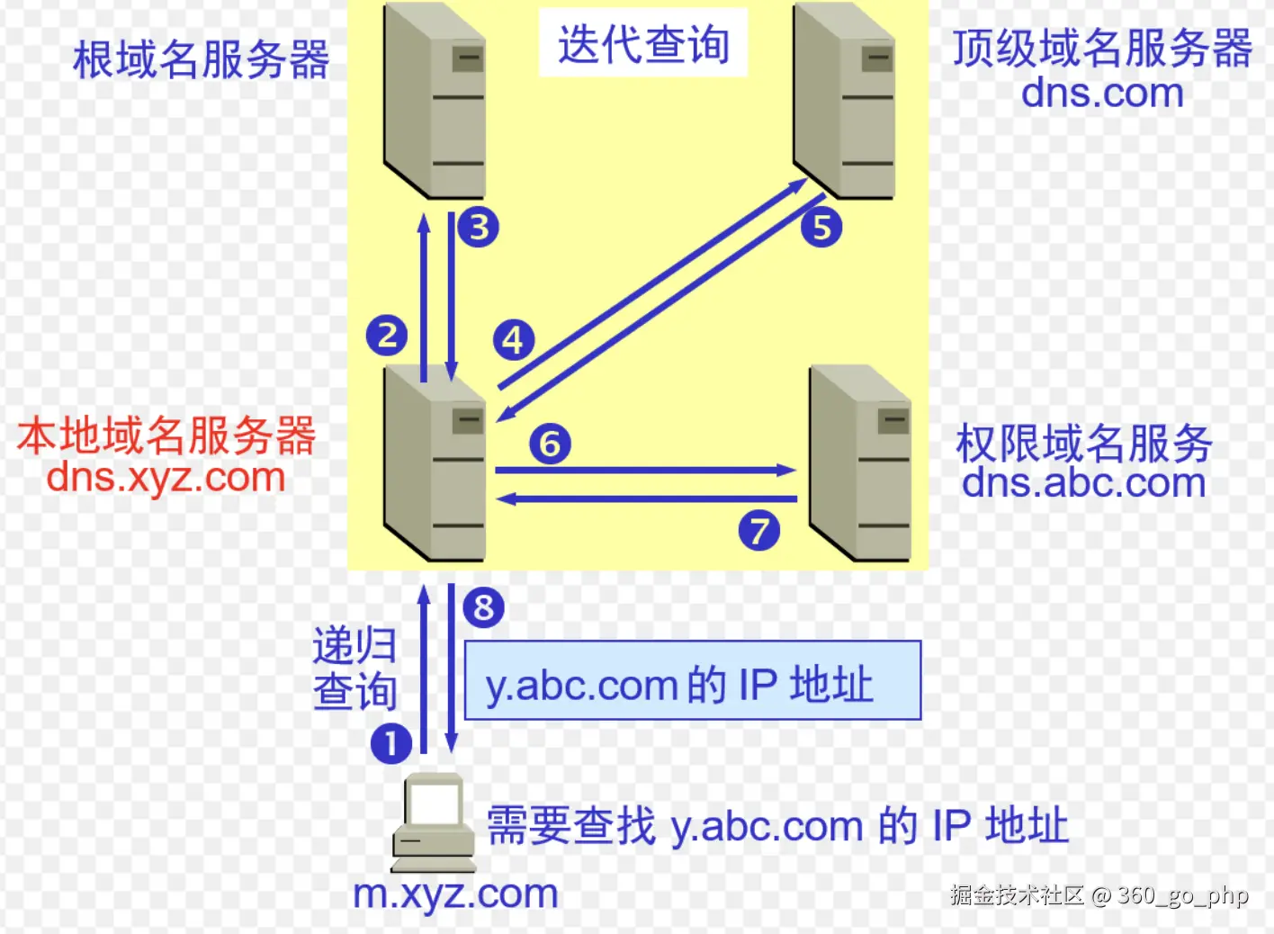 - 递归查询:如果本地没有缓存,DNS 会向根域名服务器发起递归查询,直到找到权威 DNS 服务器。