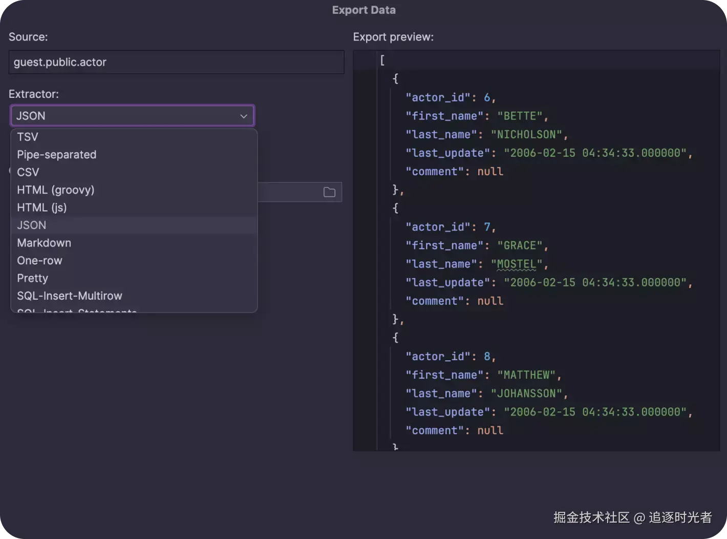 DataGrip 除了从脚本文件、CSV、TSV 或具有分隔符分隔值的文本文件导入之外,你还可以使用你喜欢的格式导出数据,包括 CSV、JSON、HTML、Markdown、Excel 等,你甚至可以自行创建格式!