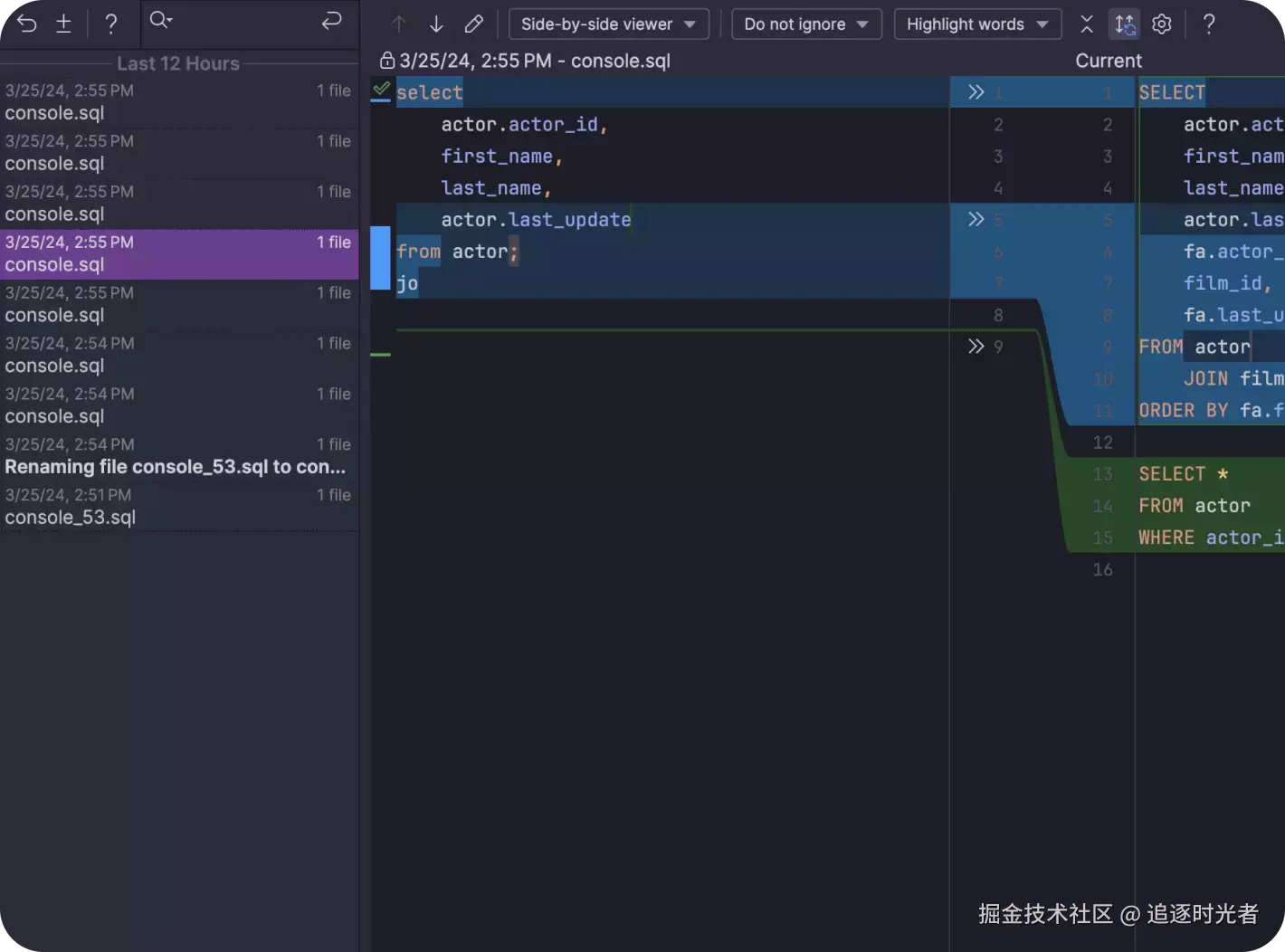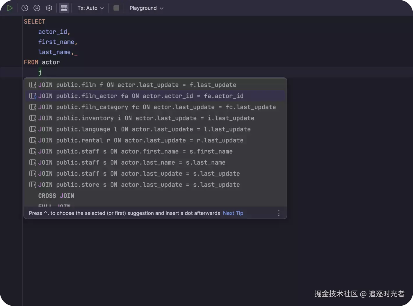 上下文相关代码补全有助于你更快速地编写 SQL 代码。DataGrip 可以识别表结构、外键,甚至是在所编辑的代码中创建的数据库对象。