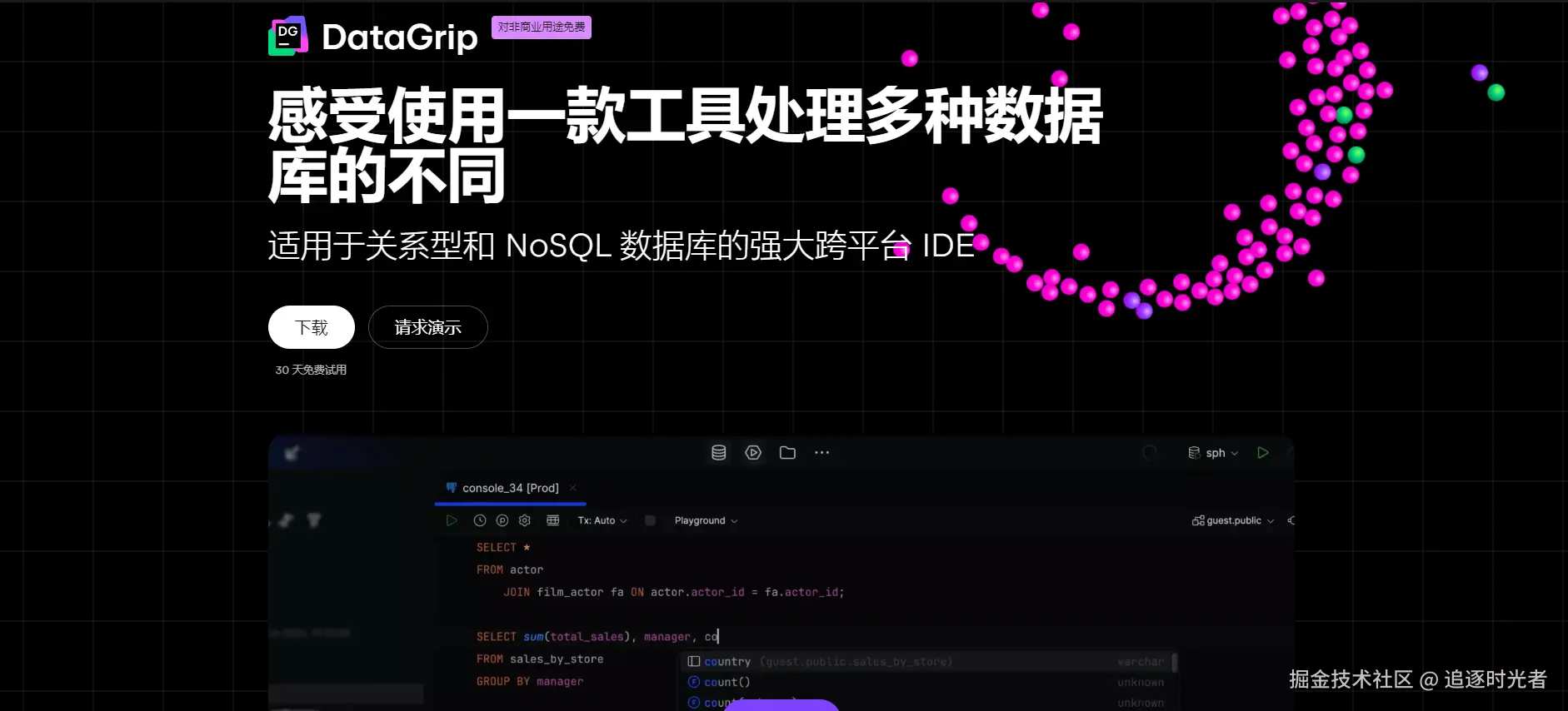 JetBrains 再放大招!继 JetBrains RustRover、CLion、Rider、WebStorm 和 RubyMine 之后,其专业数据库管理工具 DataGrip 也正式面向非商业用途免费开放。无论你是学生、开源贡献者,还是出于个人兴趣探索数据库技术,现在都可以免费使用这款功能强大的 IDE,轻松编写和管理各类 SQL 数据库,从而提升数据库处理效率,让你有更多时间专注于打造出色的项目。