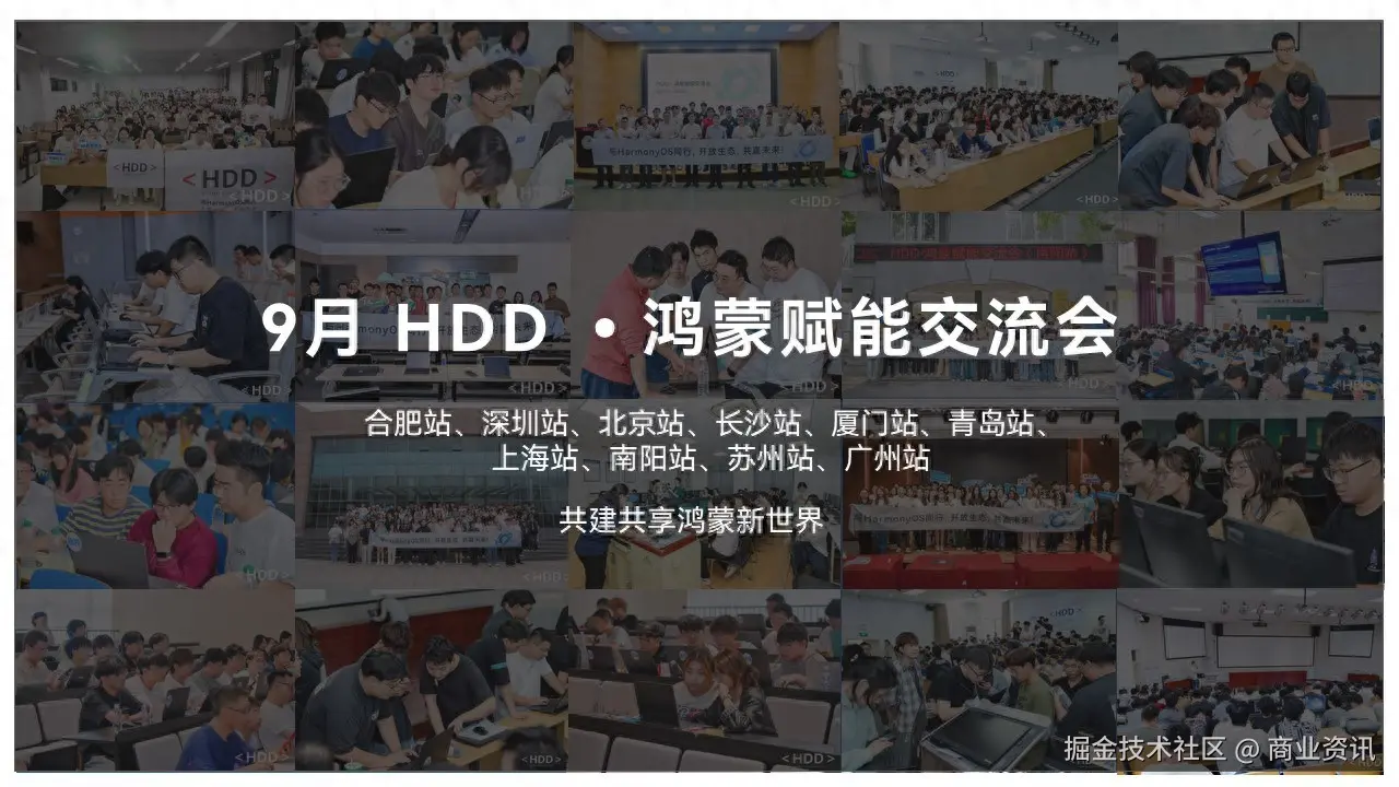 未来,HDD•鸿蒙赋能交流会将持续赋能广大开发者,推动社区深度交流。实操工坊专题活动线下将在北京、上海、成都、武汉、南京五地陆续举办,欢迎开发者们来现场上手体验、实战切磋,也可以点击链接观看线上直播课打卡实操练习:developer.huawei.com/consumer/cn…
