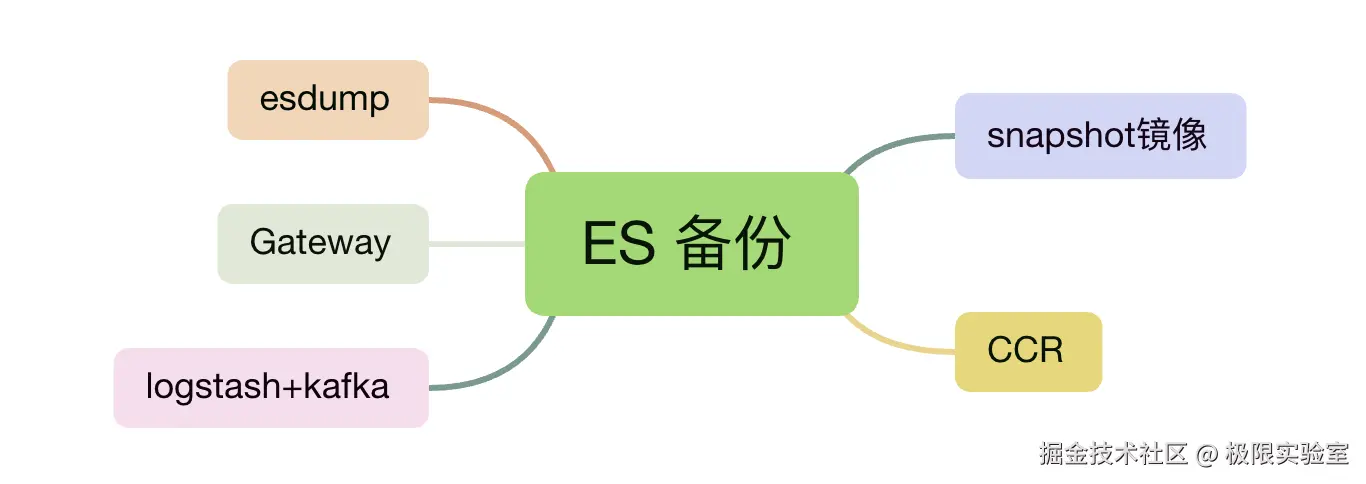 社区里,ES 的备份方案有很多,除了 ES 自带的 snapshot 和 CCR 外,还有社区里很多开源项目,如 esdump、gateway 等等,当然你也可以用 logstash+kafka 之类组件通过数据同步的自建方案(自建方案本文不进行阐述)实现数据备份的效果。