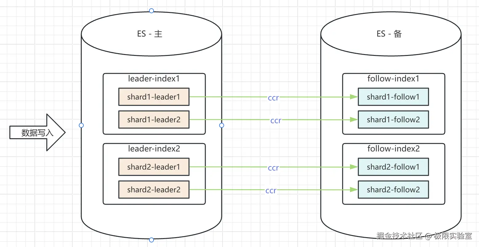 Cross Cluster Replication(CCR)是一种 Elasticsearch 提供的跨集群实时复制方案,可作为数据备份与容灾手段。其原理是将一个集群中的索引设为 leader index,在远程集群中配置对应的 follower index,通过内部的 shard-level replication 机制实时拉取并应用写入操作,保证目标索引与源索引保持高度一致。