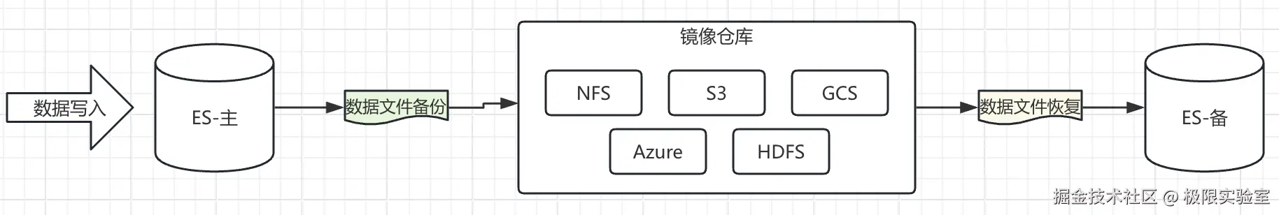 使用前需要配置快照仓库(repository),常见类型包括共享文件系统(NFS)、HDFS、S3、GCS 等,并保证所有节点都能访问该仓库。