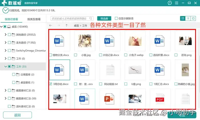 扫描出来的文件类型十分丰富,图片格式还有缩略图预览效果,一眼就能确认好目标文件。(点击还可查看高清内容)