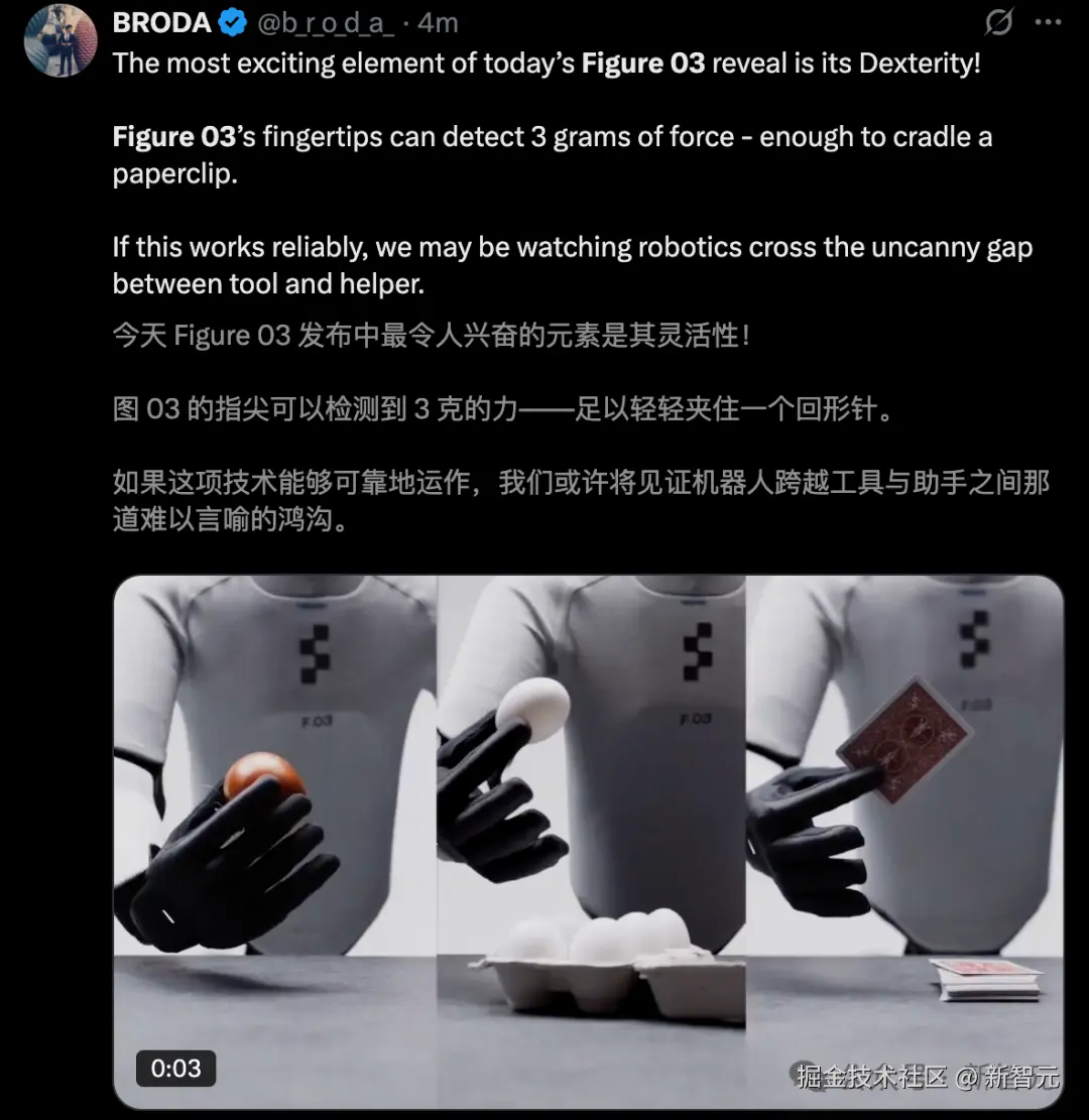 更令人惊叹的是,Figure 03 每个指尖可以感知「3 克的力」。