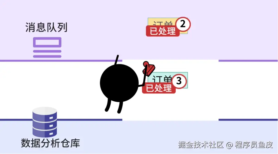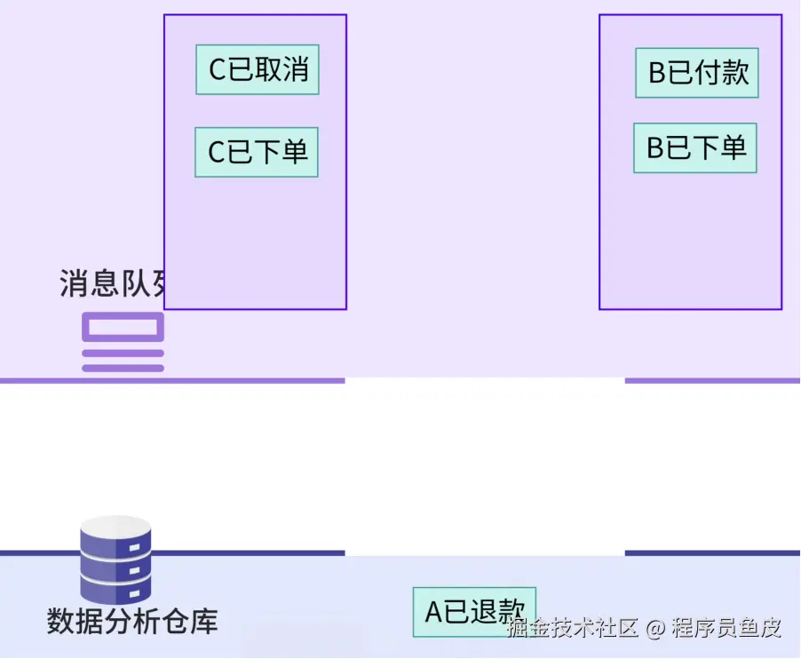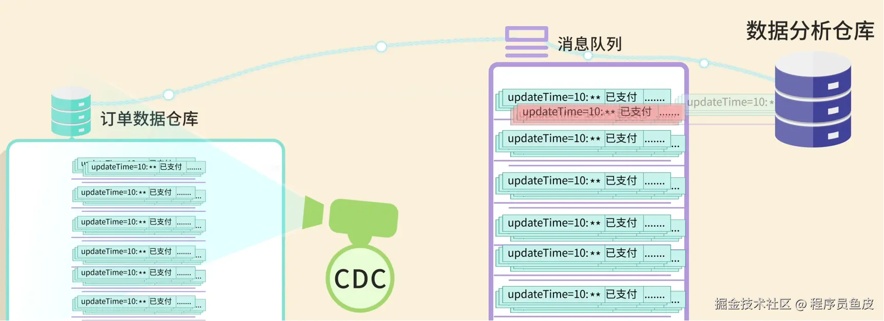 消息队列就像一个快递中转站。数据库变化的消息先发送到这个中转站,然后同步数据的程序从中转站取出数据并写入到数据分析仓库中。
