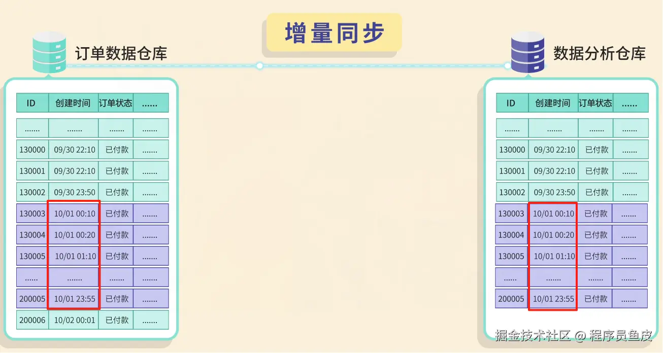 这就是 增量同步,约定每天 0 点执行同步任务,只同步昨天 0 点之后创建的订单。