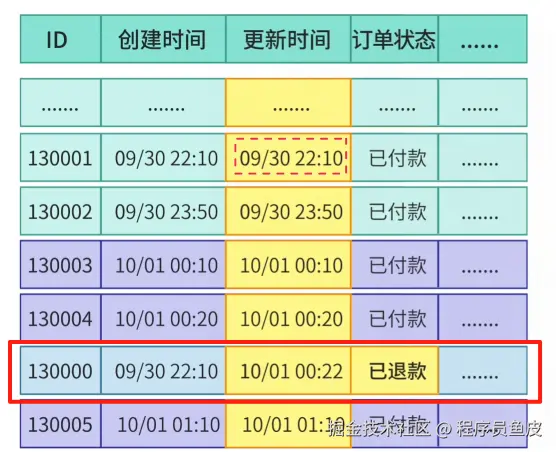 可就在查询下一页前,订单 B 因为 “修改订单状态” 被更新,这时订单 B 的更新时间就不在查询范围内了。
