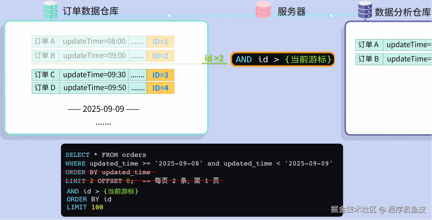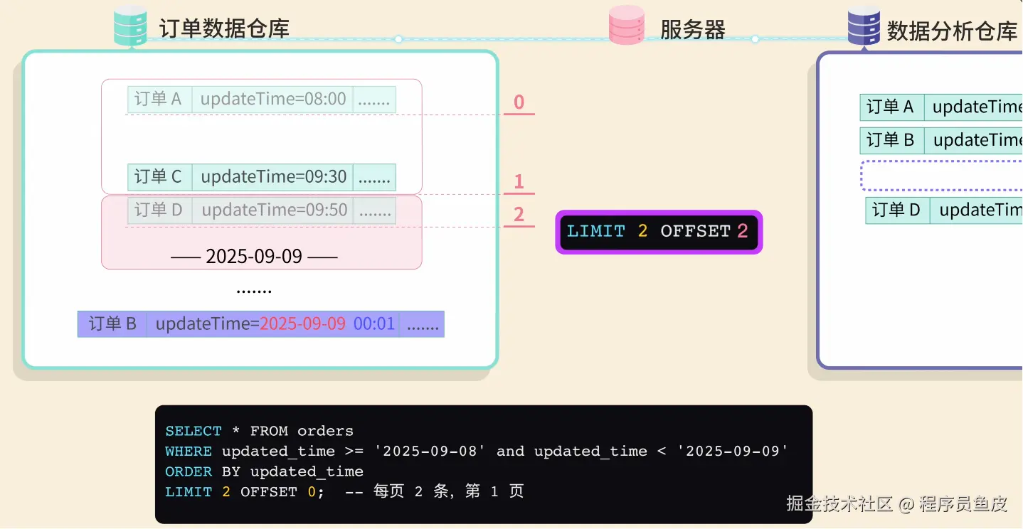 查询结果返回订单 A(08:00)和订单 B(09:00),同步完成后将偏移量调整为下一页 OFFSET=2。